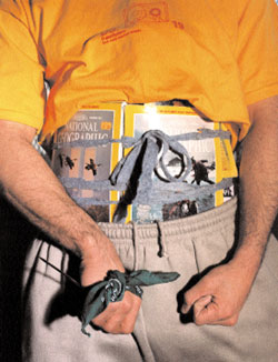 If you have beef with someone the best way to get prepared is to tie magazines around your torso. It takes 16 magazines to make the vest because they have to be two deep. The first eight (four in the front and four in the back) are stuffed down the pants and the next eight are tucked into the first eight. The magazines cant go higher than that or they impede your movement. The shiv is best hidden with a bandana.